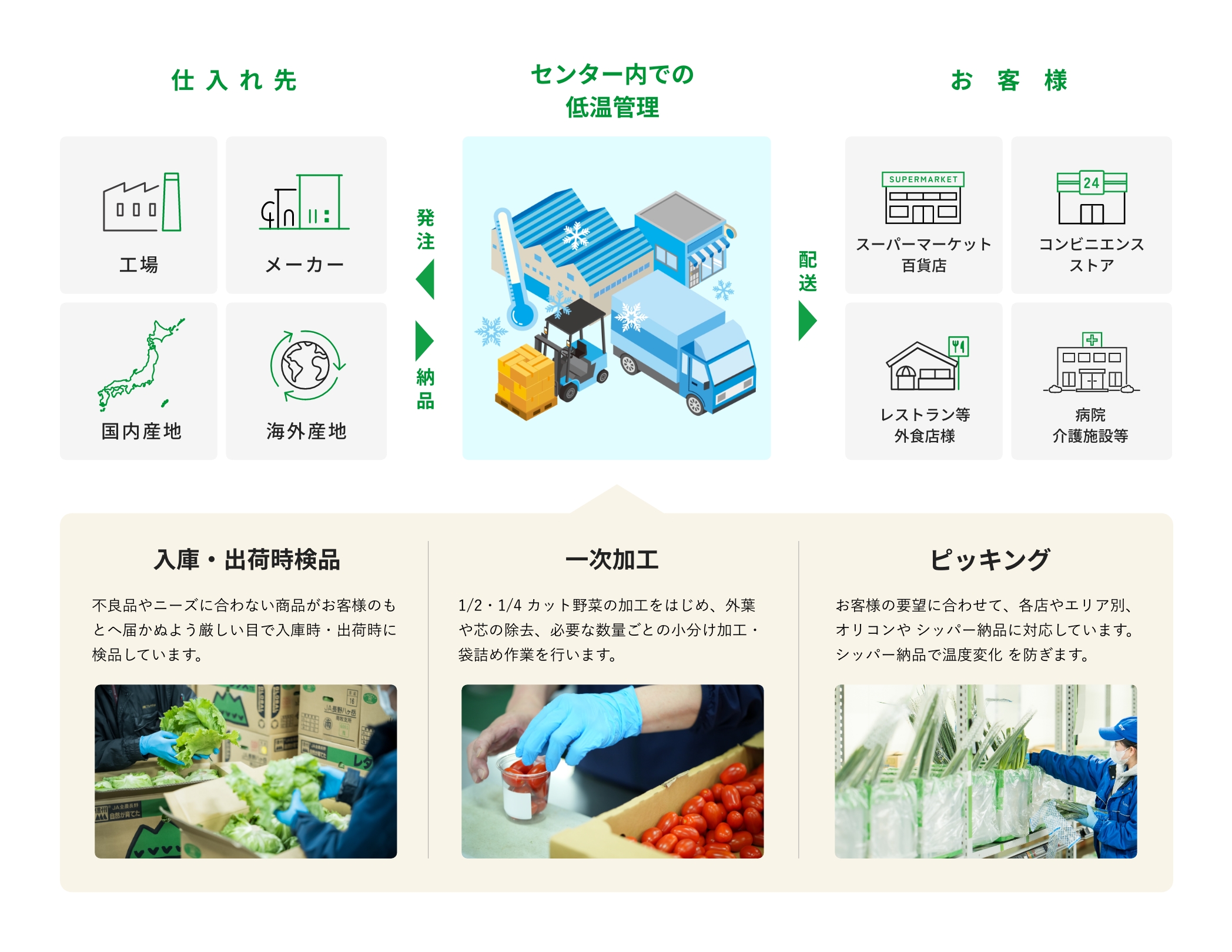 こうした環境下で、ニーズに合わせた加工・店別ピッキングを行い皆様に喜ばれるきめ細やかなサービスをご提供します。